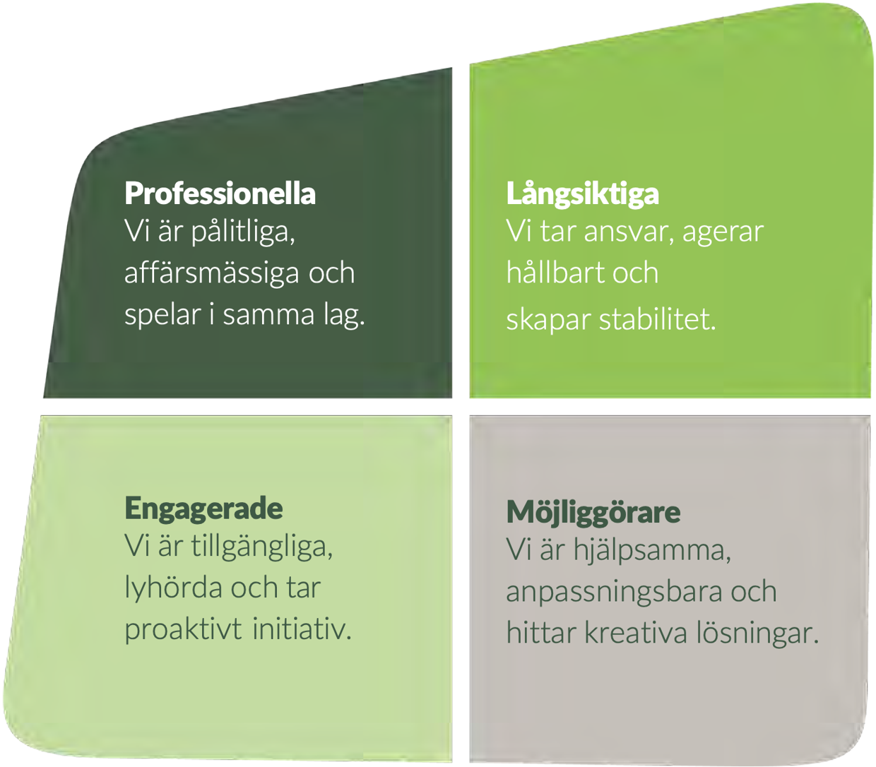 Vi strävar efter att skapa ett socialt värde för alla våra intressenter genom att agera professionellt, långsiktigt, engagerat och som möjliggörare. Genom våra värdeord och vår långsiktiga strategi arbetar vi för att främja engagemang, inkludering och ansvarstagande i allt vi gör.