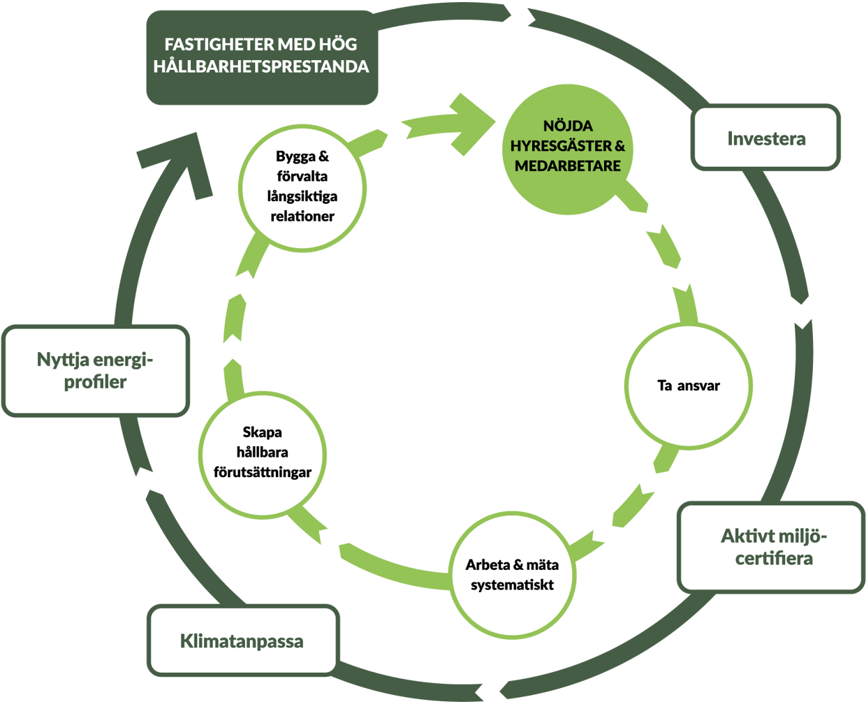 Vi har en hög hållbarhetsprofil och en ambitiös vision om att vara det mest hållbara fastighetsbolaget i Norden. Det innebär att vi förenar lönsamhet och hållbarhet i vår dagliga fastighetsverksamhet och investeringsbeslut. Det gör vi genom hållbara förvärv, energieffektivisering, optimering av fastigheter och gröna förflyttningar i samarbete med hyresgäster. Vi engagerar oss i lokalsamhället och arbetar för att främja jämställdhet, mångfald och välbefinnande för våra anställda.