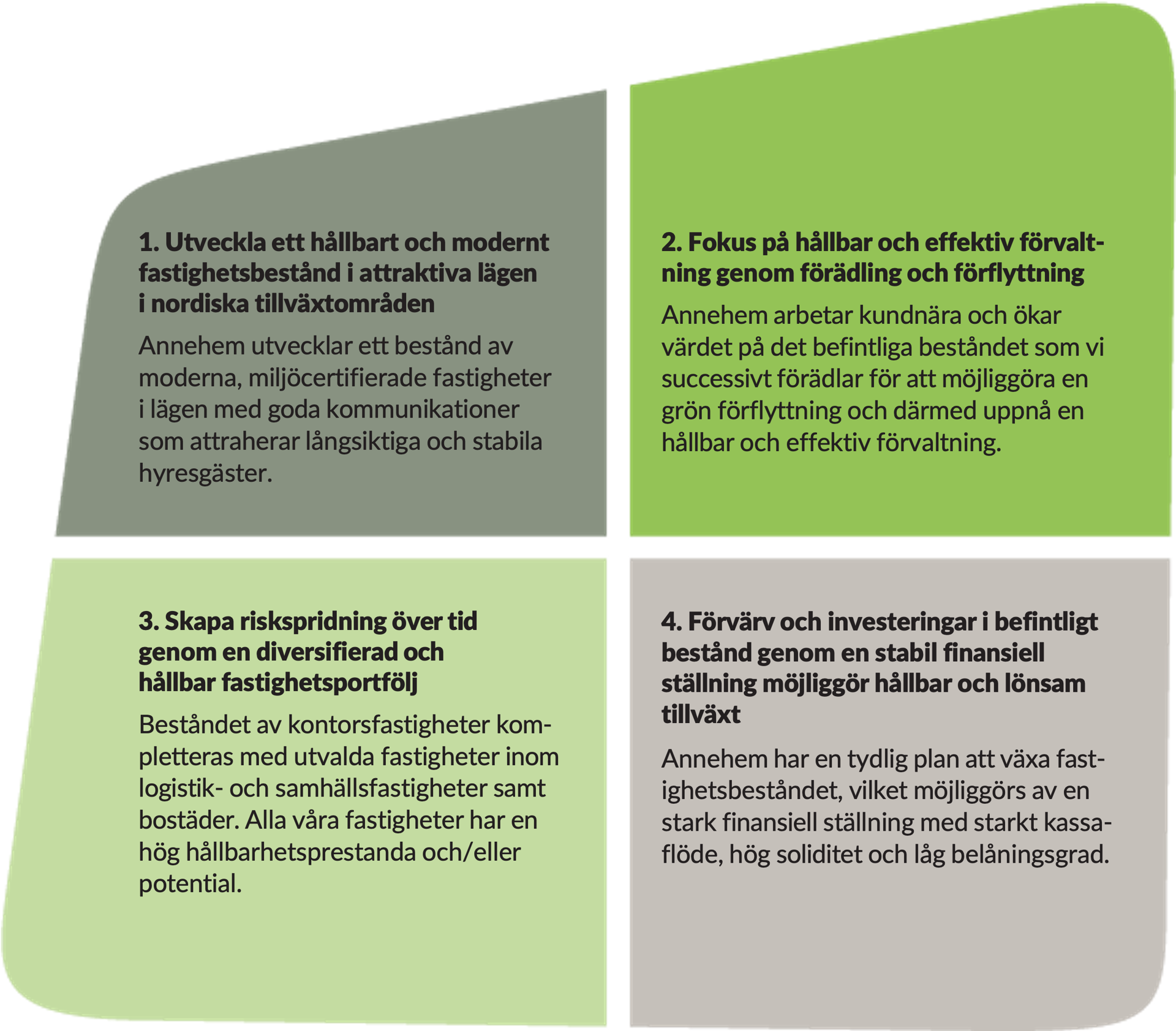 Annehems värdeskapande bygger på vår tillväxtstrategi där förvärv, investeringar i befintligt bestånd samt en kundnära och effektiv förvaltning går hand i hand med vårt hållbarhetsarbete. Därigenom skapar vi lönsam och hållbar tillväxt och fördjupar vår relation med både hyresgäster och samhället i stort.