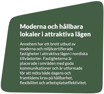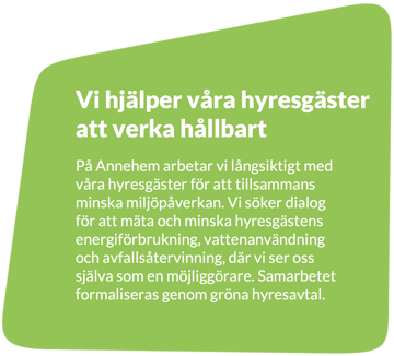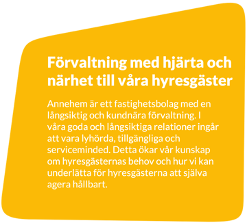 Annehem har långsiktiga och stabila hyresgäster som bedriver både kommersiell och offentlig verksamhet. Vi förvaltar med hjärta och närhet till våra hyresgäster.