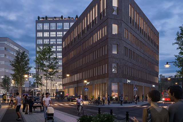 Modern kontorsfastighet med fem våningar och källare med ett entréplan som kan nyttjas som butiksytor.
