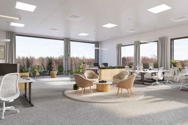 En modern och ljus kontorsfastighet med flexibla ytor som kan anpassas efter olika behov, idealisk för företag som söker en praktisk och funktionell arbetsmiljö. Kombinationen av stilren design och hållbara material skapar en behaglig och effektiv arbetsplats.